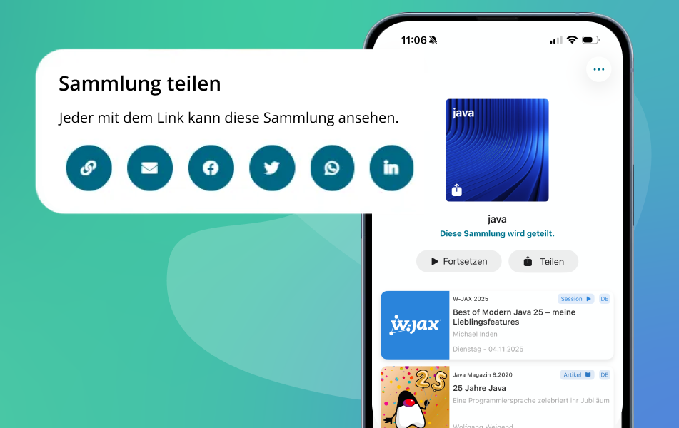 Ab sofort kannst du deine selbst erstellten Sammlungen auf entwickler.de mit Kolleg:innen teilen. So arbeitet dein Team immer mit dem gleichen Kontext – beim Onboarding, in Projekten oder beim Upskilling.